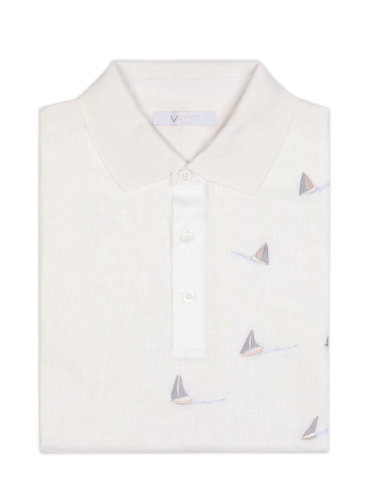 Alphauomo Beyaz Polo Yaka Yelken İşlemeli Pamuk Keten Regular Fit Tişört