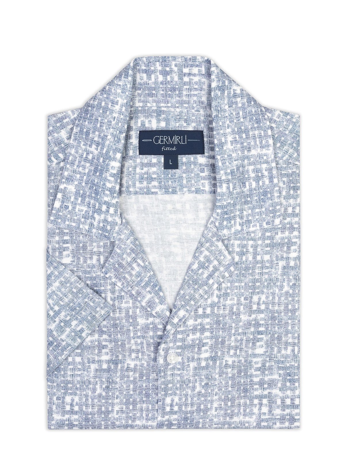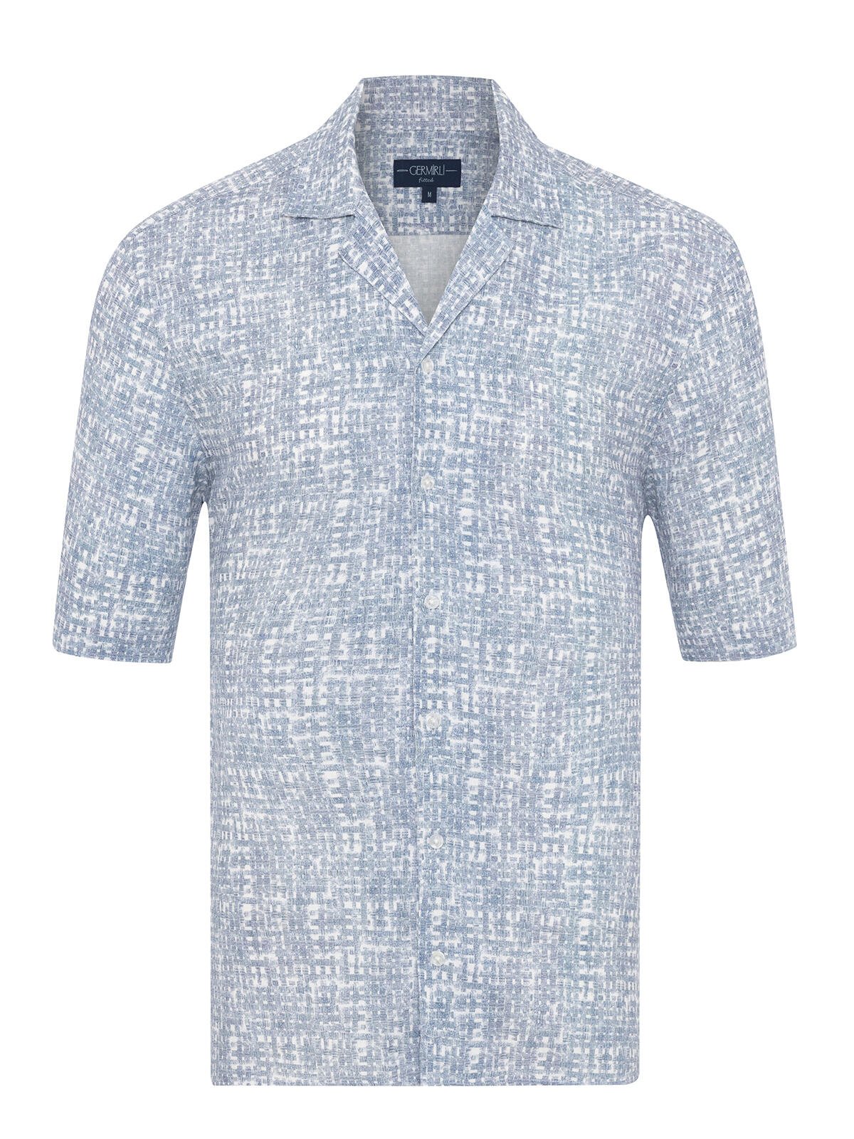 Germirli Blue Geometric Patterned Tailor-Fit Hawaiian Collar Summer Cotton Linen Shirt