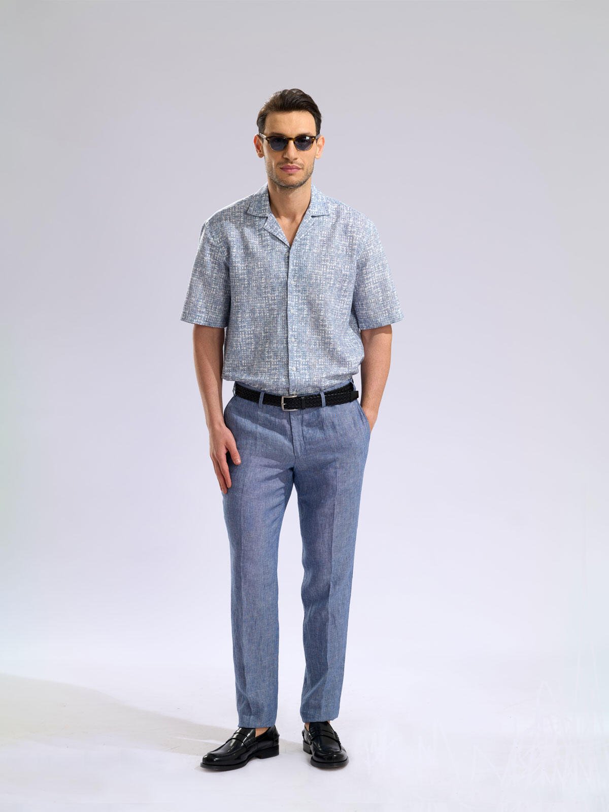 Offering both comfort and elegance in the summer heat, this Hawaiian collar shirt stands out with its geometric patterns in blue tones. Made of cotton linen fabric, this shirt keeps you cool thanks to its breathability. A must-have for your summer wardrobe, this shirt is ideal for everyday use with its lightweight and comfortable structure. This design, which you can wear without sacrificing your elegance both on the beach and in the city, creates an eye-catching look in any environment with its vibrant colors and modern cut. Linen's natural texture and Hawaiian collar style will be indispensable for summer evenings.