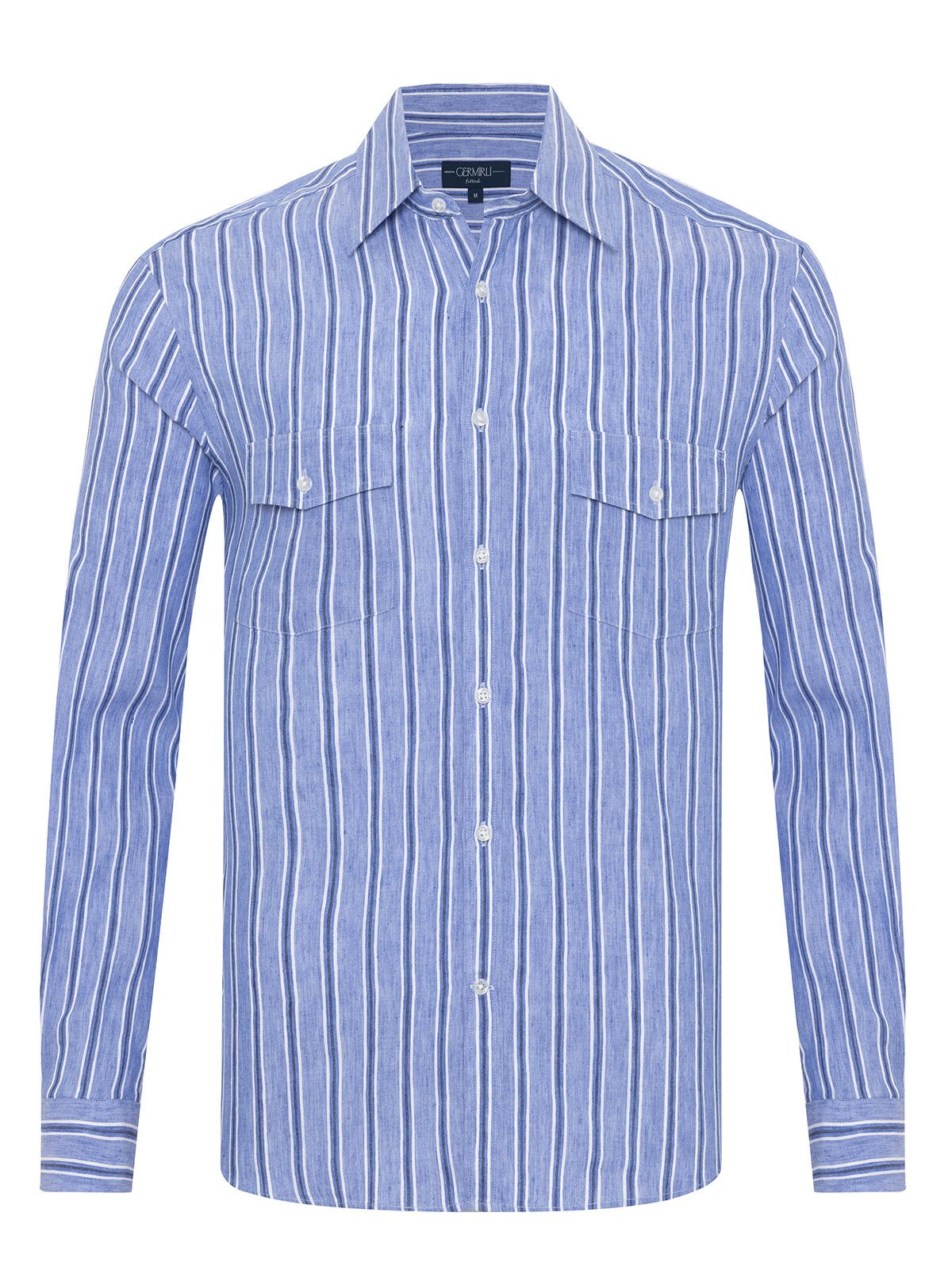Germirli Soft Collar Double Flap Pocket Tailor Fit Blue Navy Striped Cotton Linen Shirt