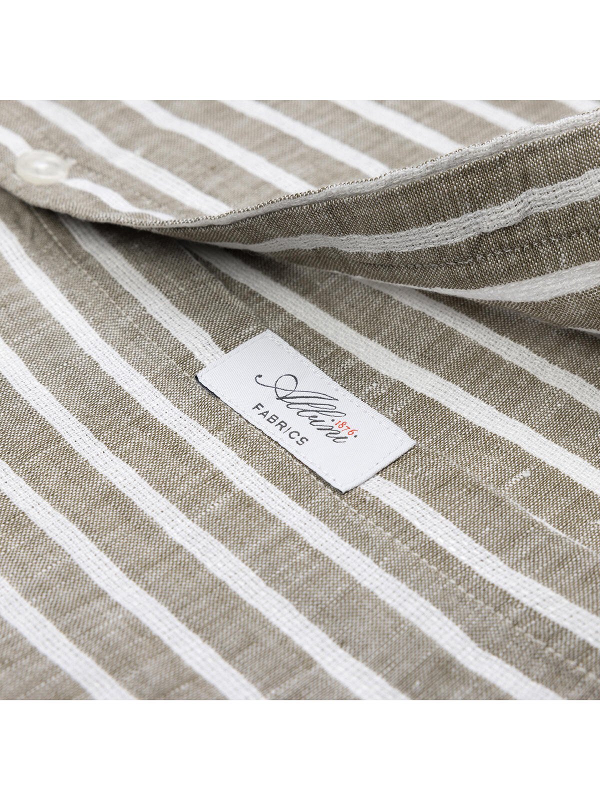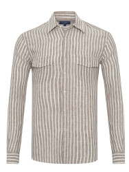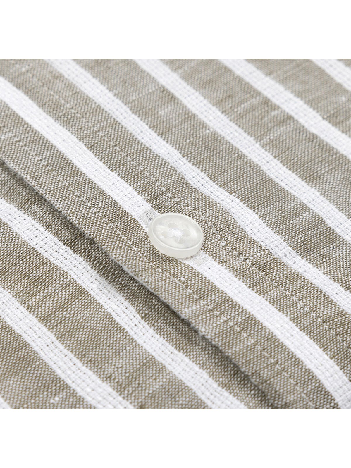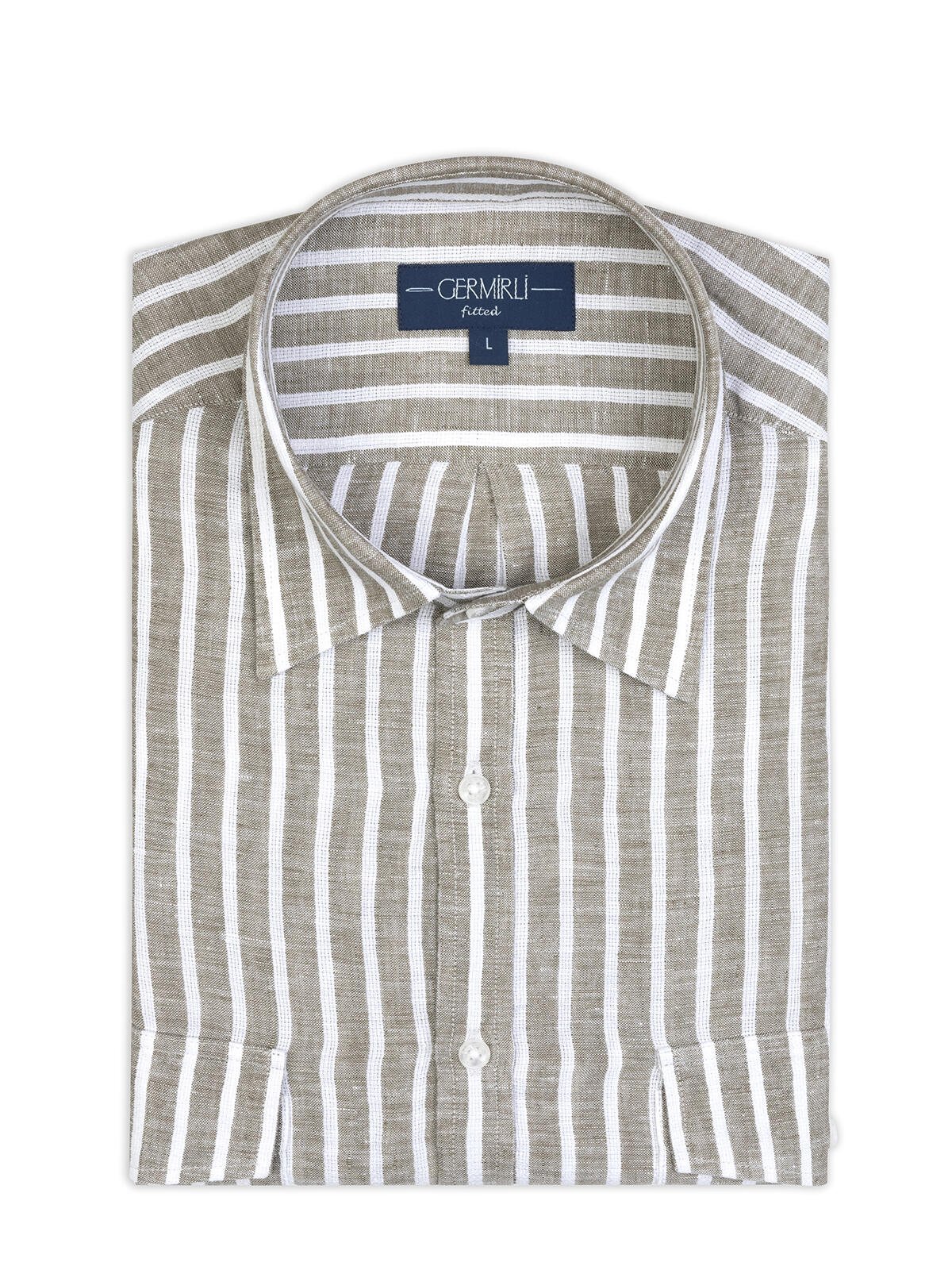Germirli Soft Collar Double Flap Pocket Tailor Fit Khaki White Striped Pure Linen Shirt