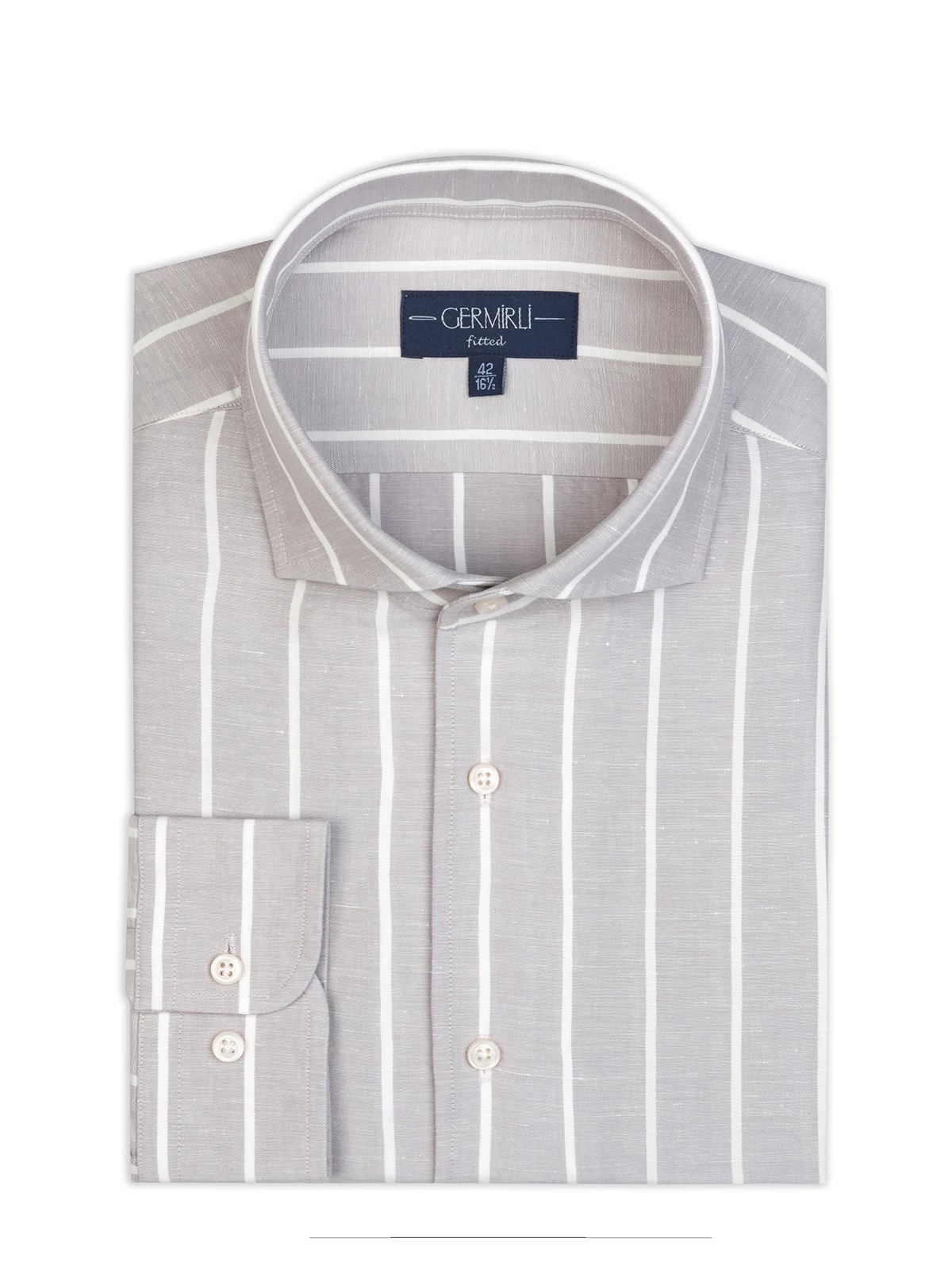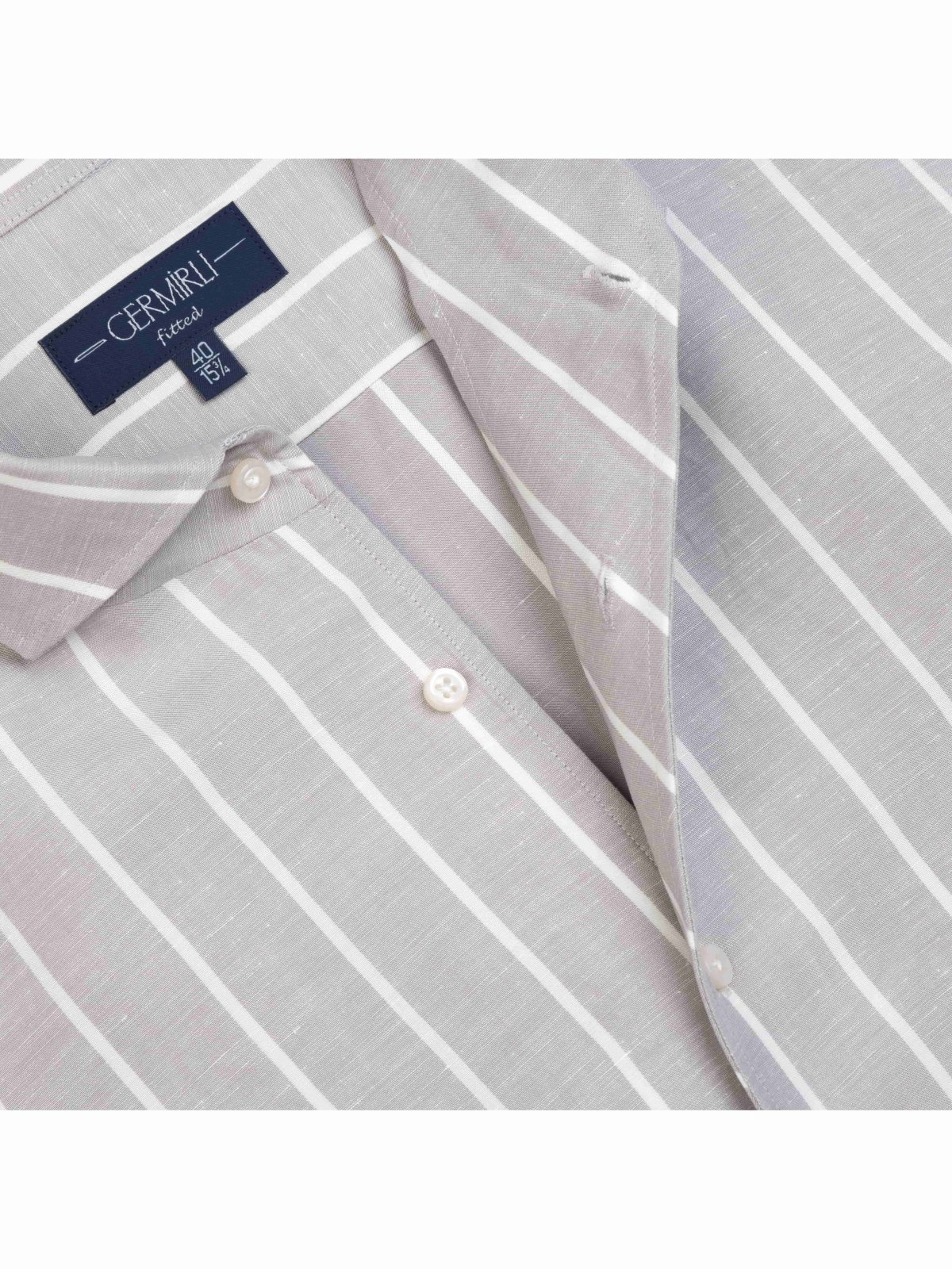 Germirli Gri Kalın Çizgili Nevapas Lapel Yaka Lyocell Keten Gömlek
