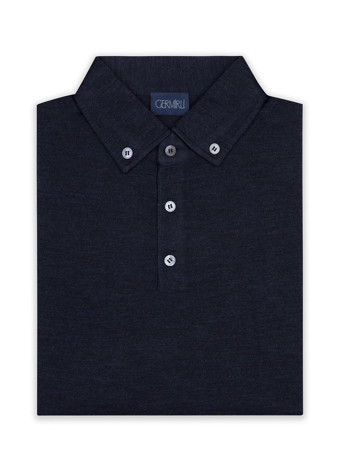 Germirli Lacivert Düğmeli Polo Yaka Regular Fit Extra Fine Yün Erkek Triko