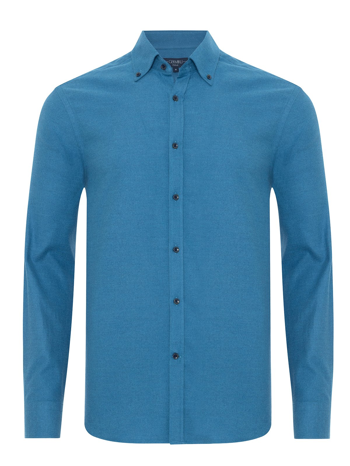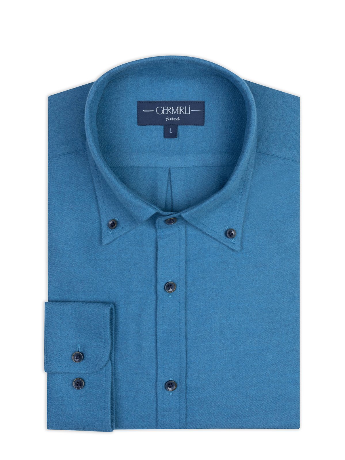 Germirli Koyu Mavi Düz Tailor Fit Rahat Kalıp Düğmeli Yaka Albini Flanel Gömlek