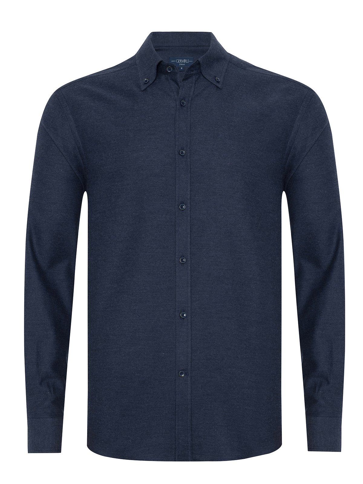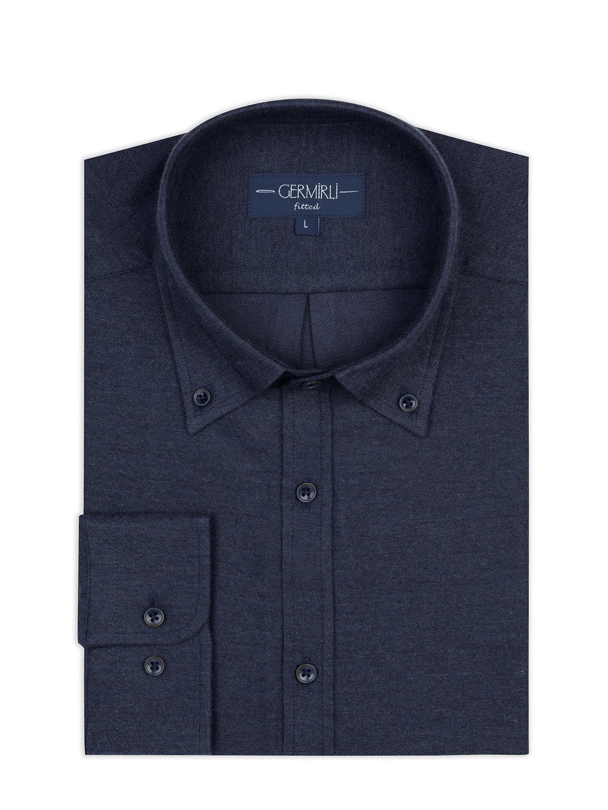Germirli Lacivert Flanel Düğmeli Yaka Tailor Fit Pamuk Gömlek