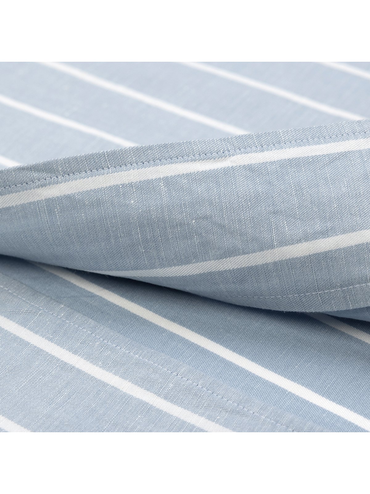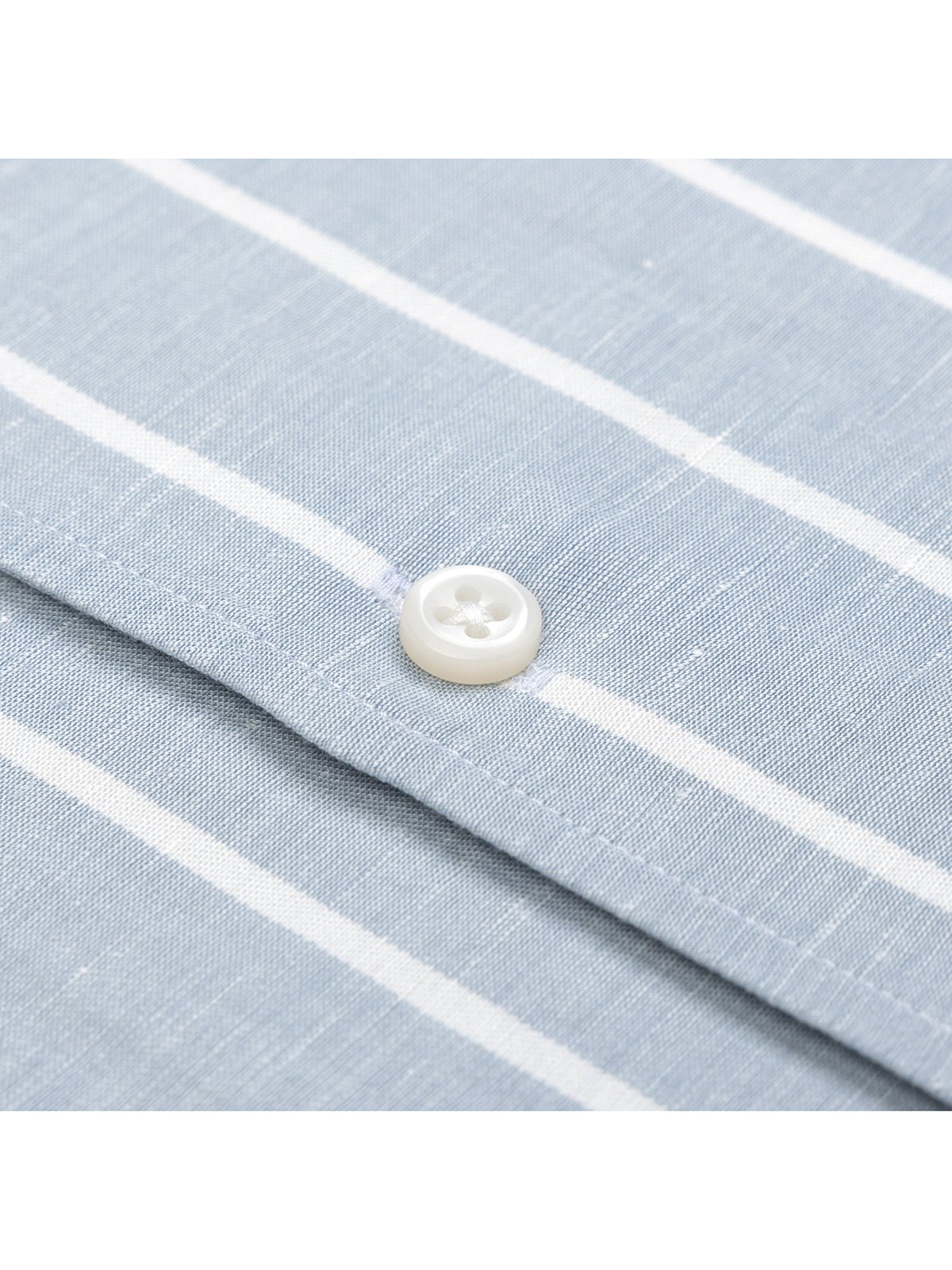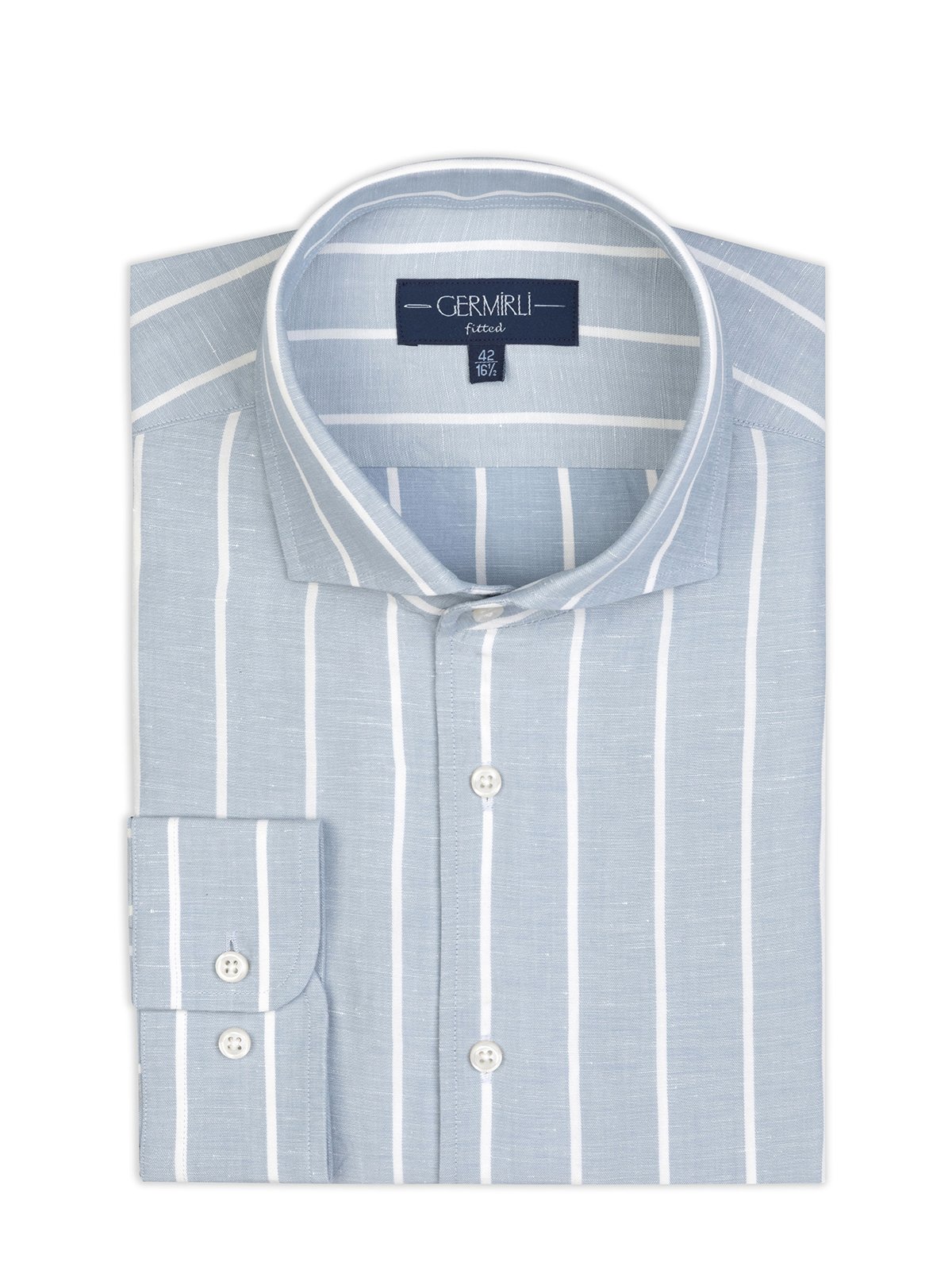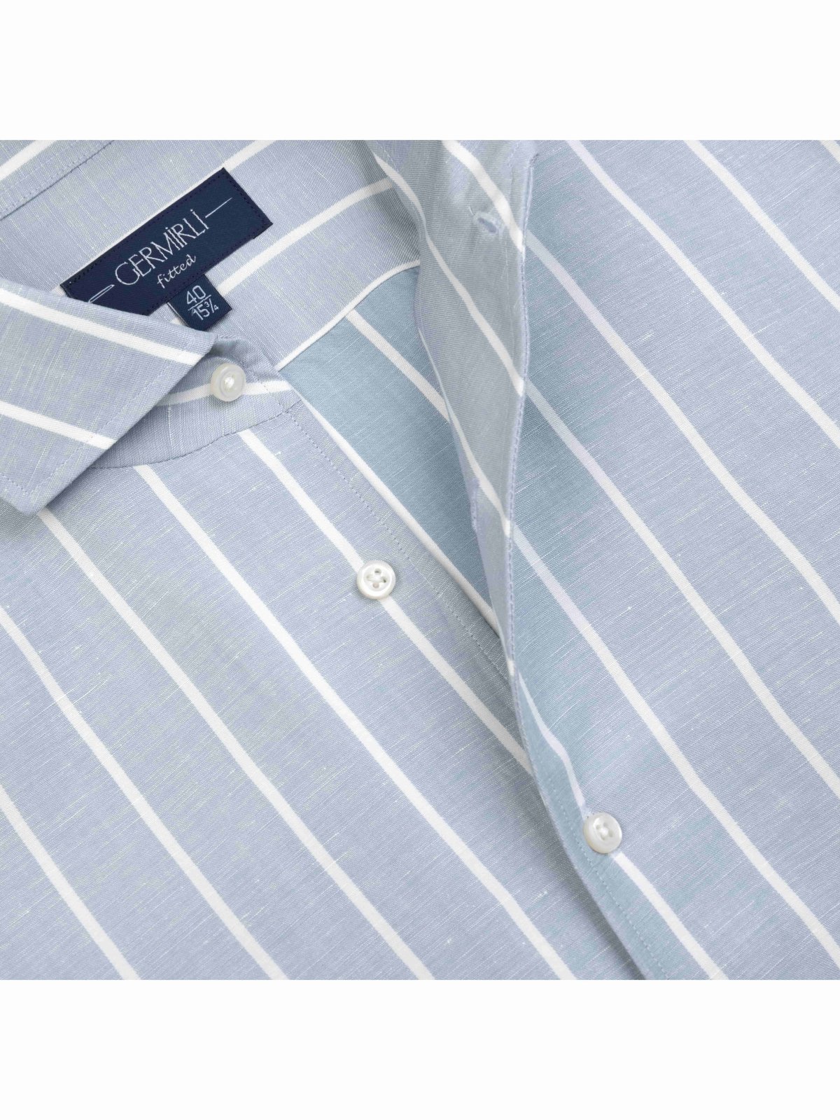 Germirli Mavi Beyaz Çizgili Nevapas Lapel Yaka Keten Gömlek