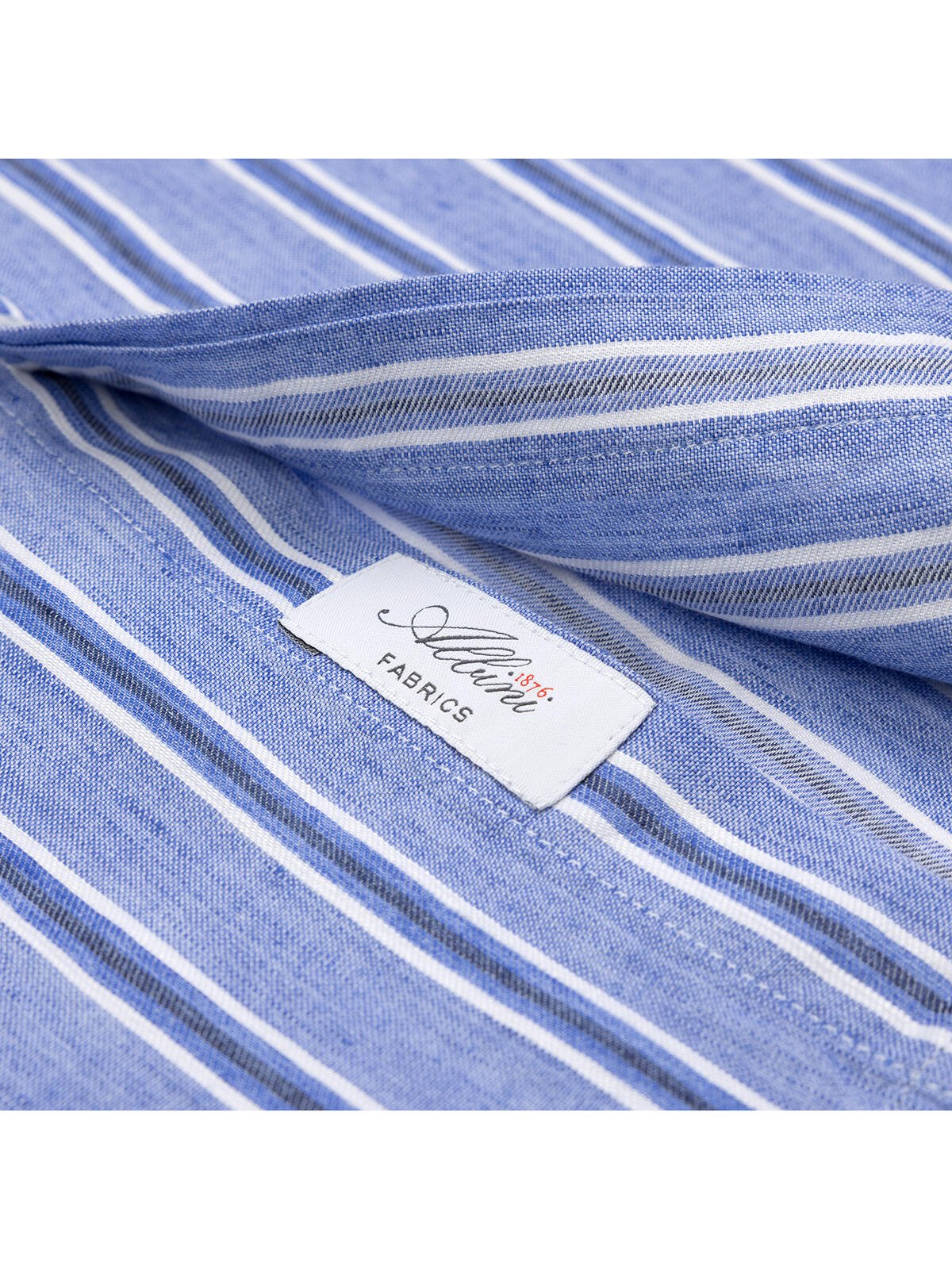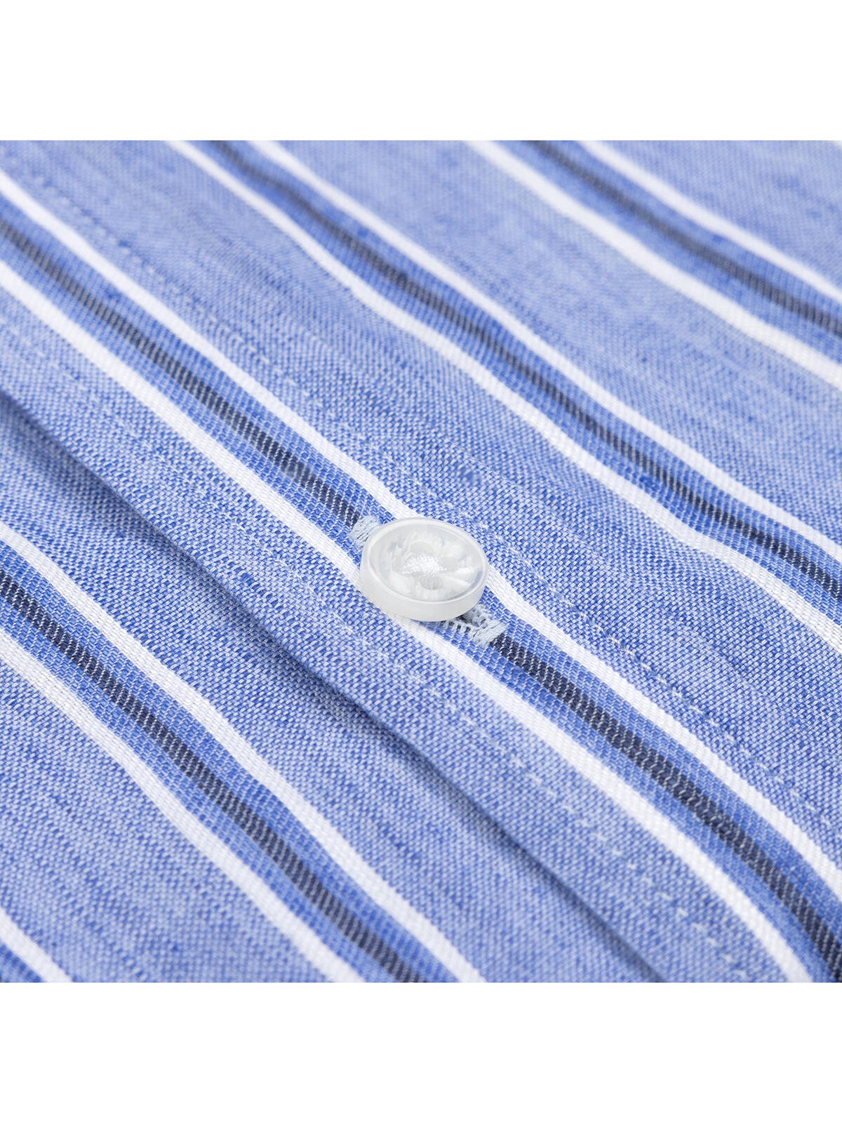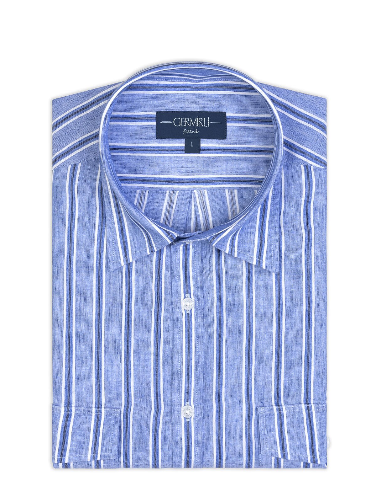 Germirli Soft Yaka Çift Kapak Cepli Tailor Fit Mavi Laci Çizgili Pamuk Keten Gömlek